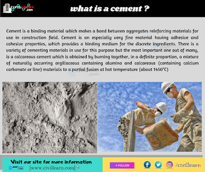 Cement is a very important material for use in the construction field because without cement↗ the construction work is not possible. It is an especially very fine material having adhesive and cohesive properties, which provides a binding medium for the discrete ingredients. There is a variety of cementing materials in use for this purpose but the most important one out of many, is a calcareous cement which is obtained by burning together, in a definite proportion, a mixture of naturally occurring argillaceous containing alumina and calcareous (containing calcium carbonate or line) materials to a partial fusion at hot temperature (about 1450°C)Main different types of cement and their uses (AS PER IS CODE)